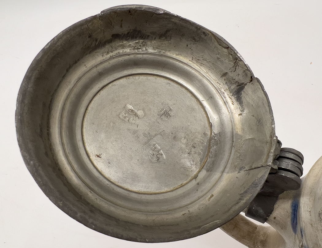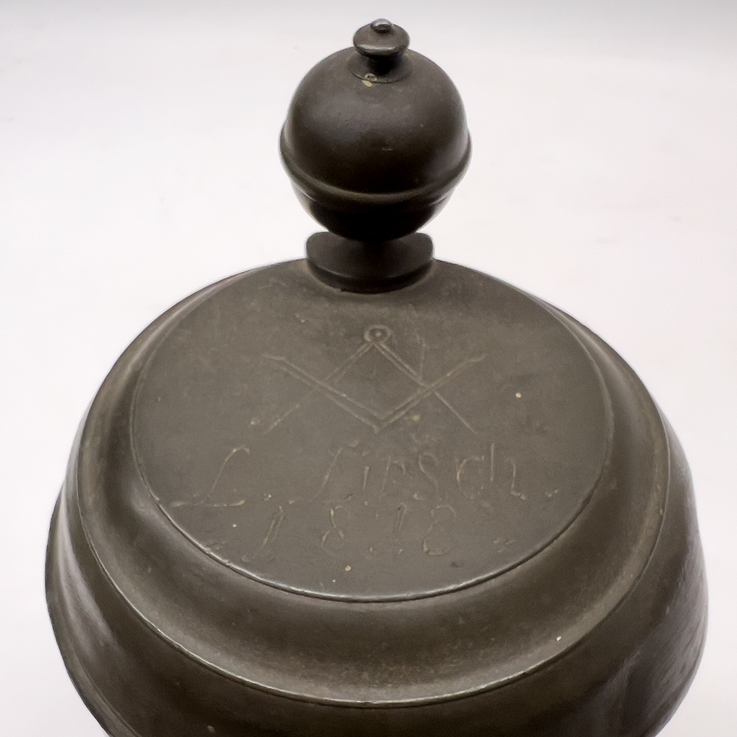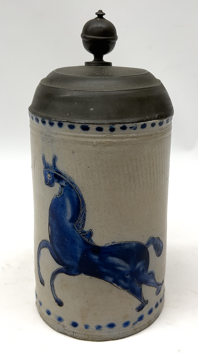 inside of lid with three hallmarks; pewter lid incised with an etched Masonic seal and 'L. Lipsch / 181'; decorated with a deep cobalt blue rearing horse, and blue dots circle rim and base; 10" h to top of finial; top 4.75"diam.