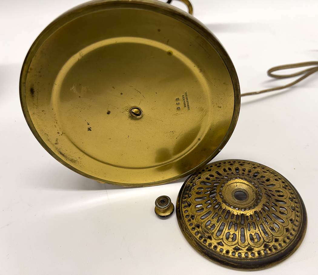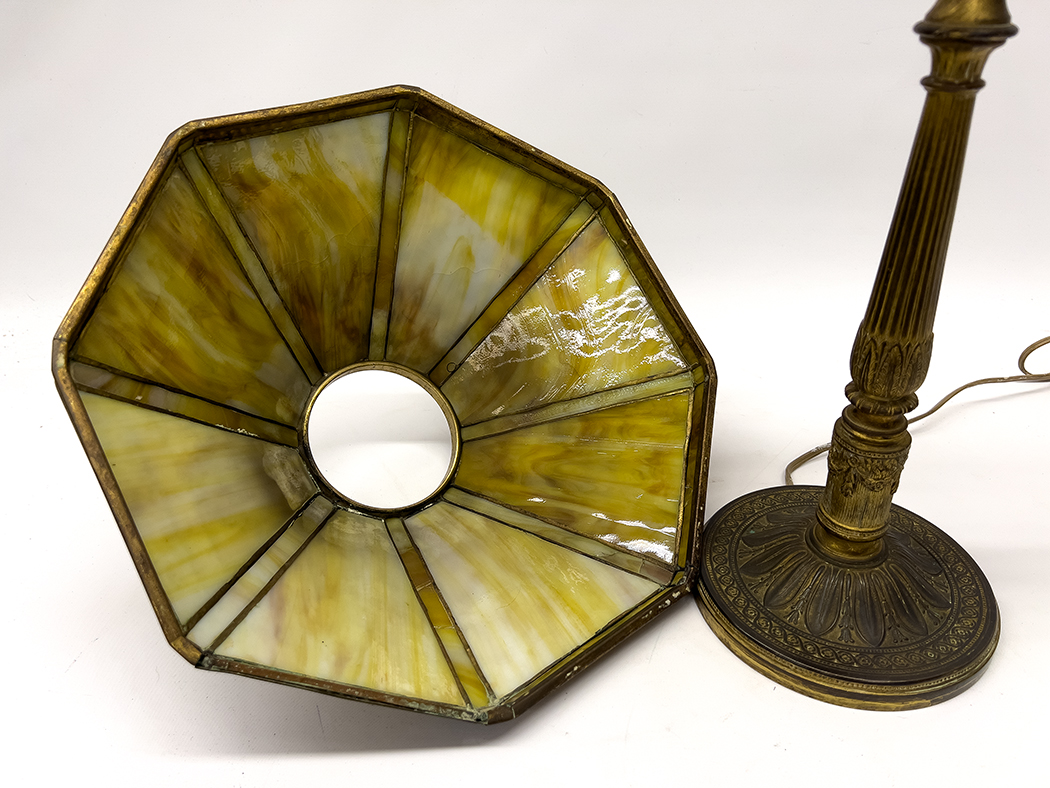 octagonal shade with striated amber glass panels, with original heat cap. The base decorated with the acanthus leaf and garland trim; 17.5"h; shade 13" diam.