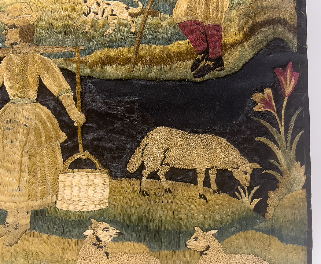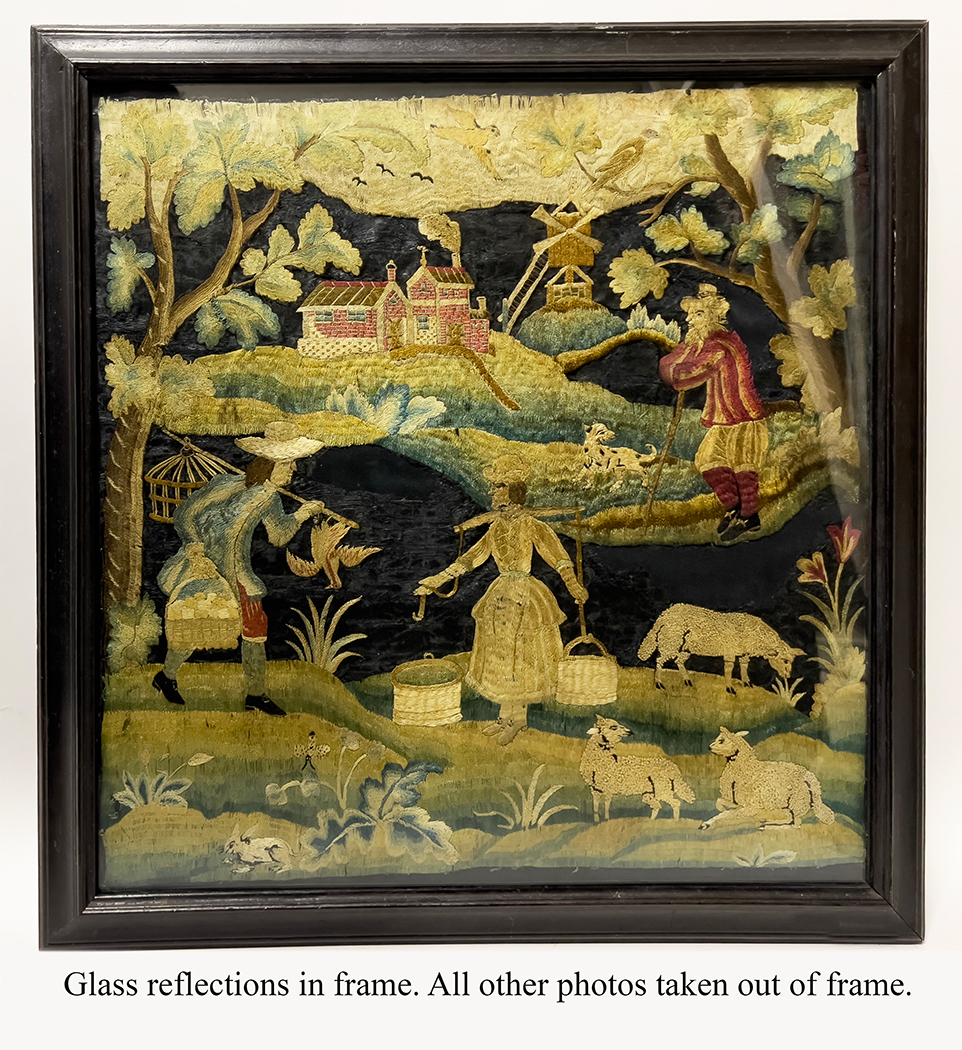 depicting woman carrying water, three sheep by edge of river; shepherd leaning on his staff, his dog, and a duck catcher; brick building and windmill in distance, on black fabric; needlework 19 by 18 in; framed, under glass 21.5 by 21 in.