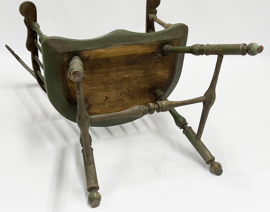 late 19th c.; old green paint; 9-spindle, scrolled ears; spayed turned legs joined by H-stretcher; 46.5"h; saddle seat 18"h; 24.5"w