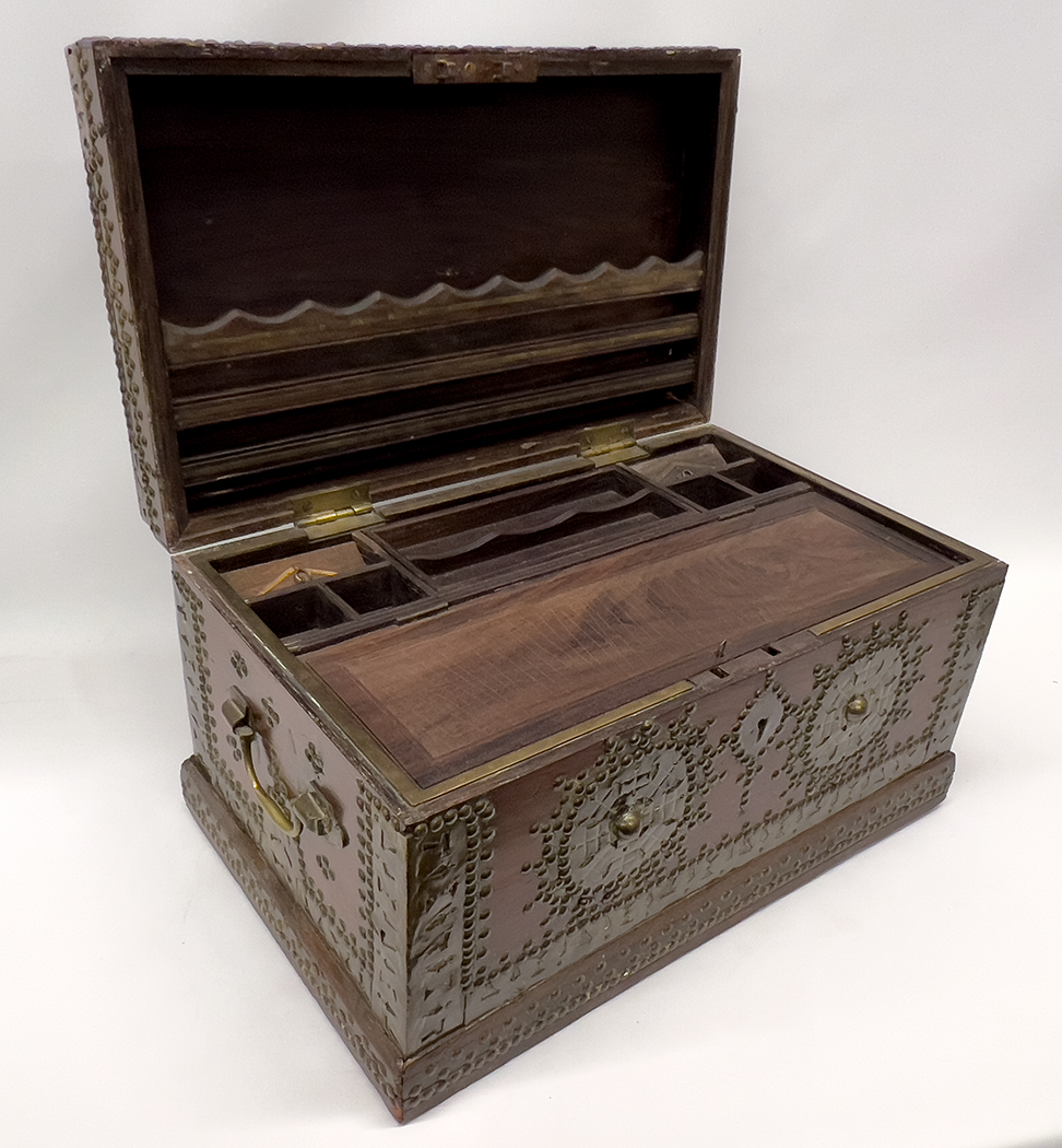 mid 19th c.; fitted with writing surface, two layers of various compartments and trays;brass bound corners and overall ornate applied brass stud decoration; brass side carrying handles; 12"h; 21.5"w; 13"d