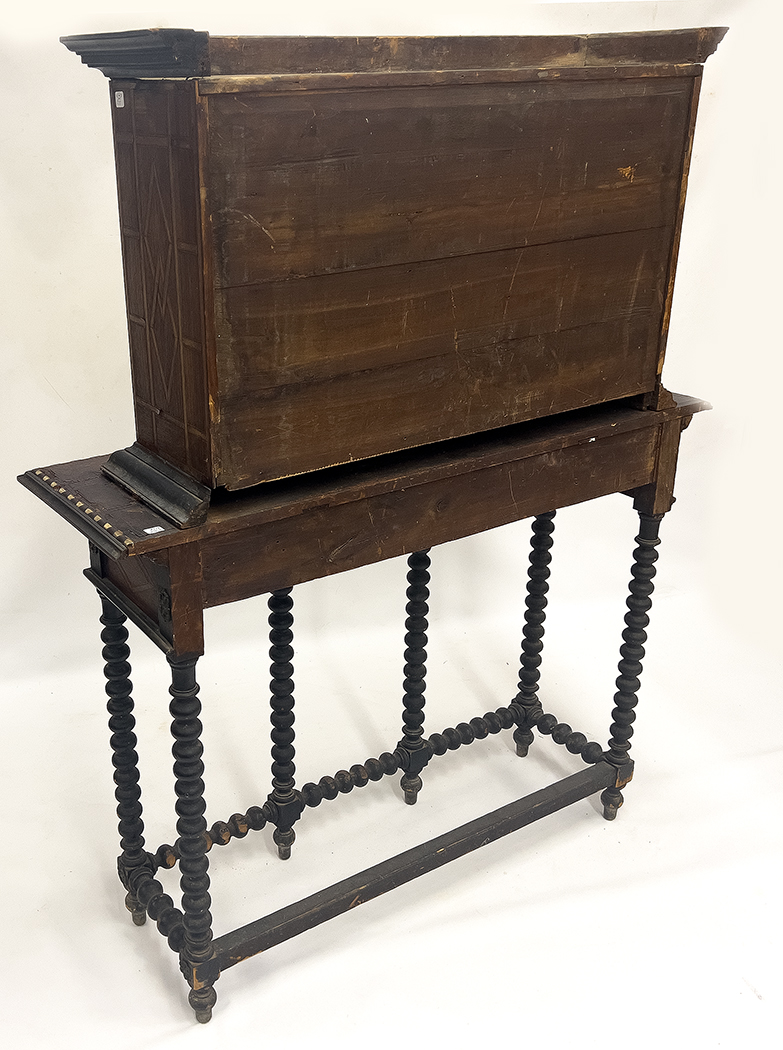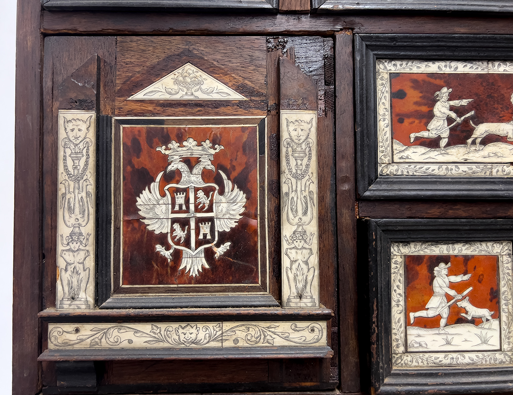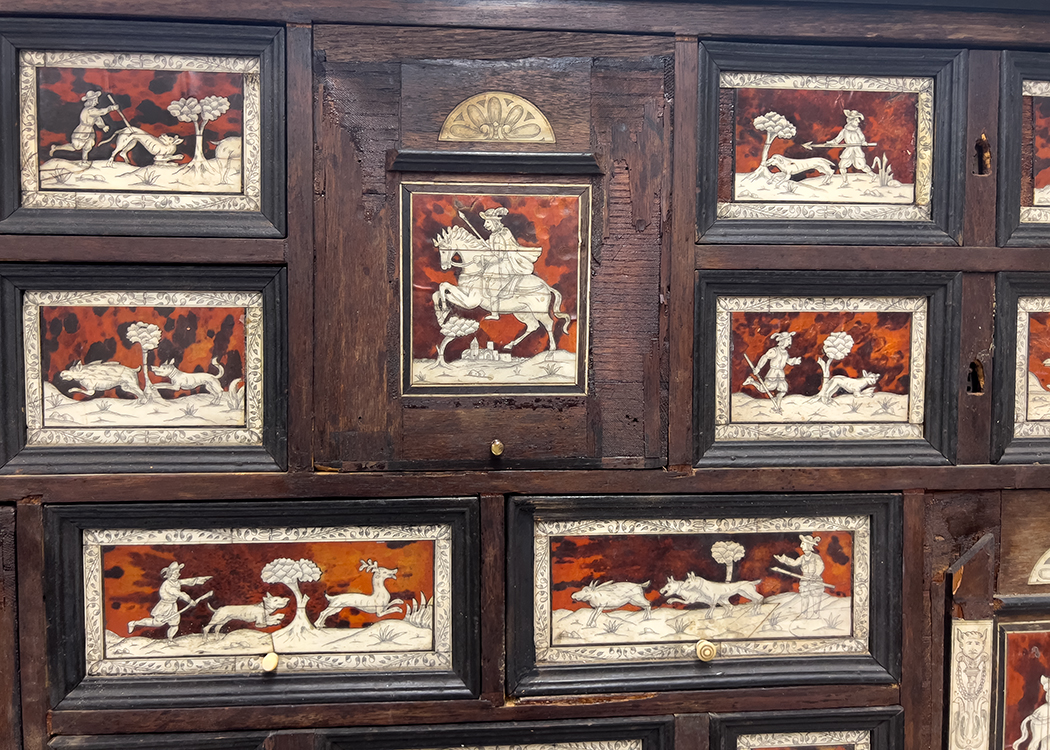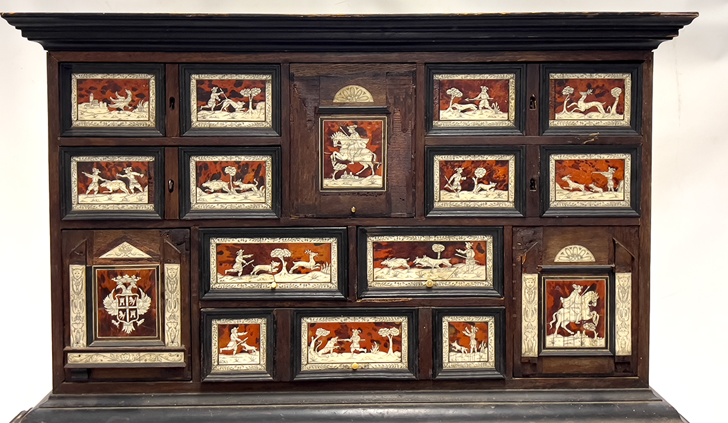 late 18th c.; the cabinet with ten various sized drawers set with tortoiseshell panels inlaid with bone hunting scenes, one panel with the family crest; rest on original stand with six burl panels with conforming, inlaid bone hunt scenes; rope-turned legs joined by stretchers; total 60"h; cabinet, 24"h, 39.5"w, 12"d; the stand 36"h, 47"w, 15.5"d