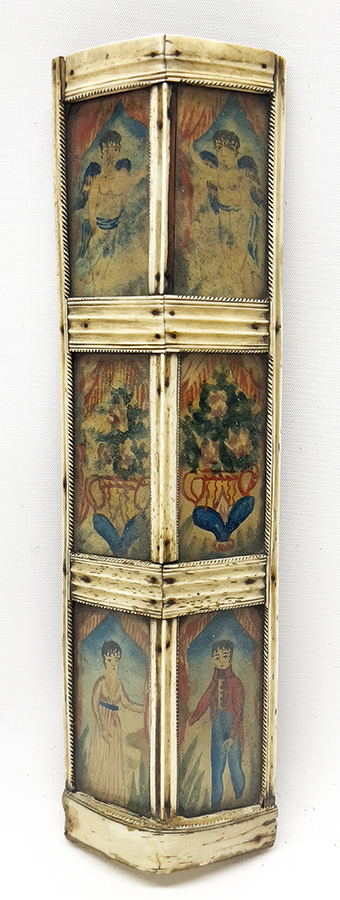 c. 1835, triangular sliding top with six watercolor panels, four depicting figural portraits and two with urns and flowers; each long side with three watercolor panels; the ends with floral watercolor panel; all panels under glass; the interior with (53) dominoes tiles; 4"h; 10"w; 4"d