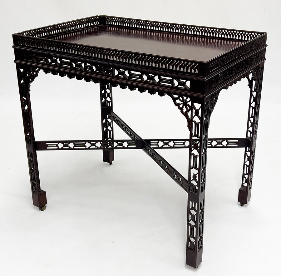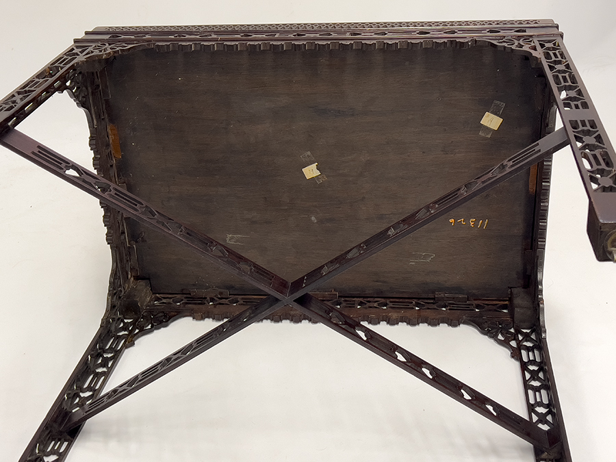 pierced fretwork gallery; fretwork straight legs joined by fretwork X-stretchers; on casters; 30"h; 32"w; 21"d