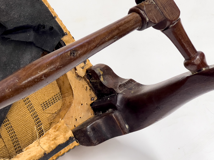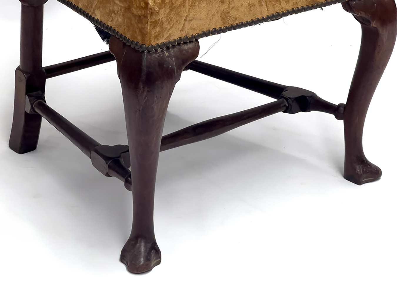 18th c. good old color, all sidechairs; carved scroll to backrail; shaped splats; over-upholstered seats; cabriole legs ending joined by block and turned stretchers; webbed feet; back 37"h; seat rail 21.5"w; 18"d; seat height 18"