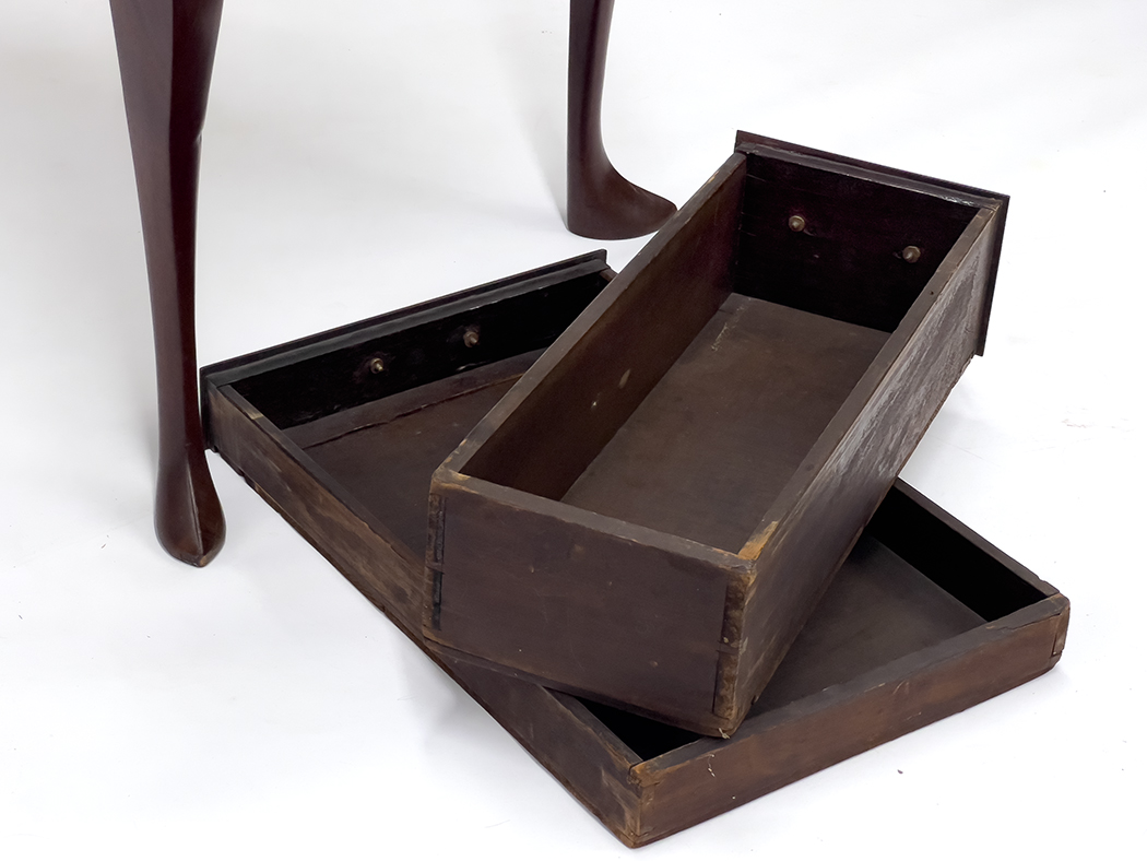 long drawer over three with period batwing brass; shaped apron; delicate cabriole legs ending in a slipper foot; 30.5"h; case 30.5"w, 20"d; molded top 36"w, 22"d