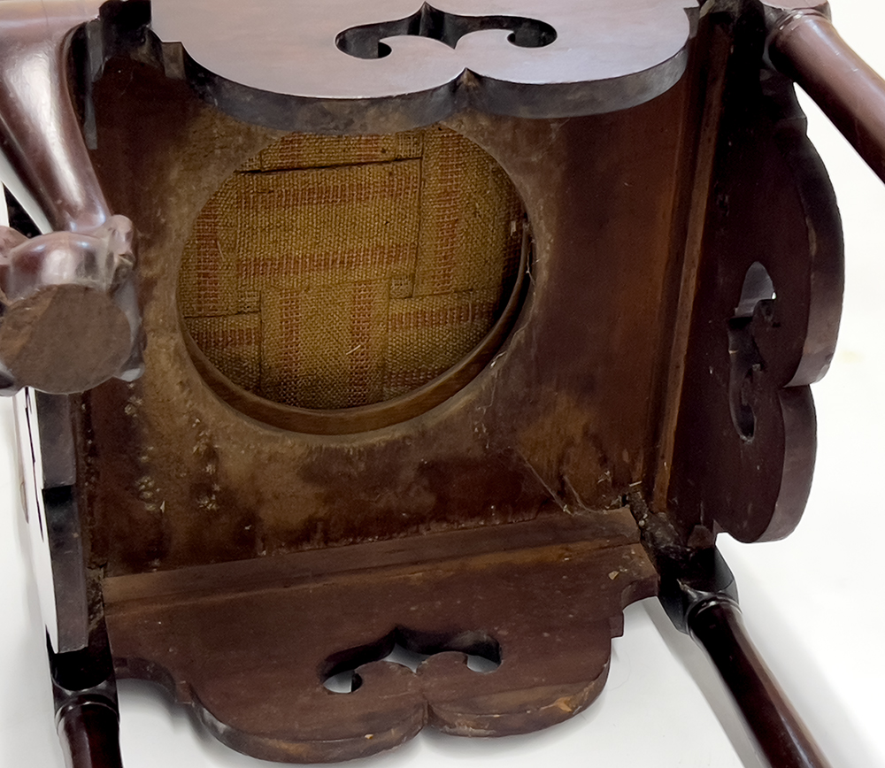c. 1770, cut-out heart to spats; cut-out apron; four legs joined by stretchers, ball and claw feet; cut-out potty seat under cushion; back 34"h; seat 17"h; 31" at widest