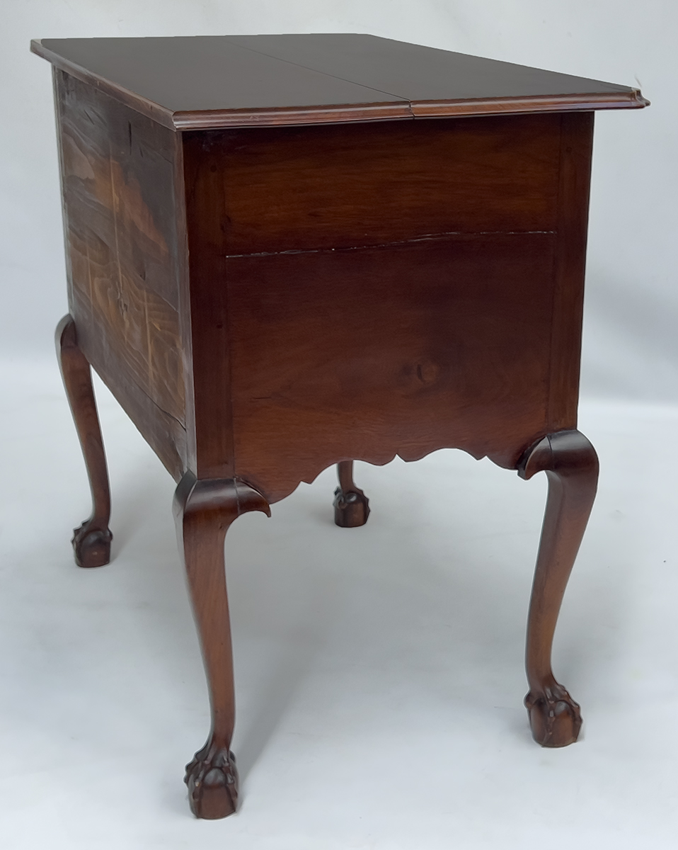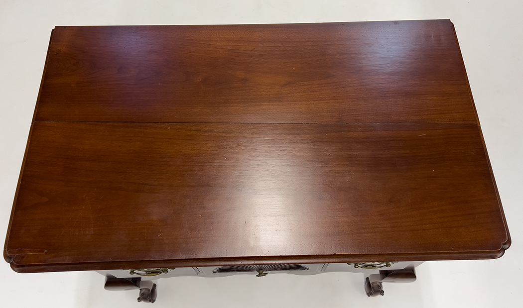 molded top with long drawer over three, the center drawer fan carved; shaped apron; cabriole legs ending in bold ball and claw feet; 31"h; case 30"w, 18"d; top 35"w, 20.5"d