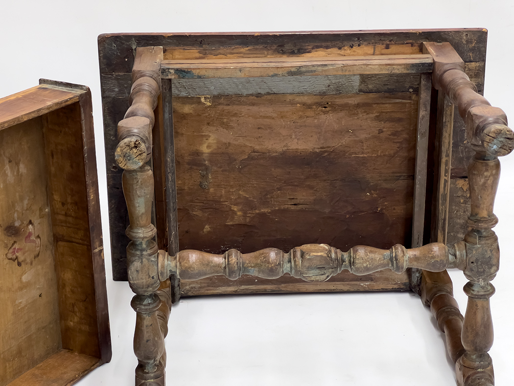 pine and hardwood; old color; long drawer to apron; boldly turned legs and stretchers; 25"h; 32"w; 22"d