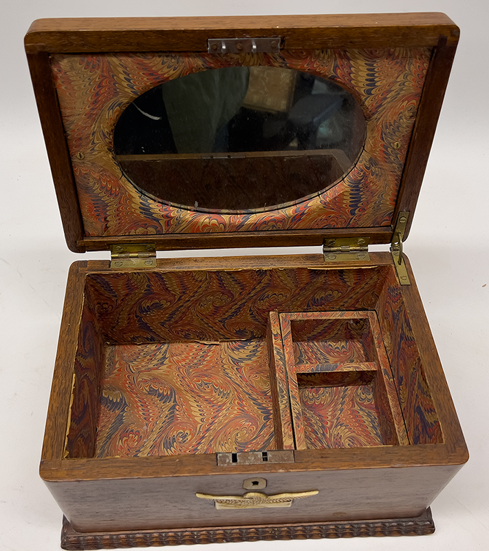 hinged lid with applied initials I.H; applied bone eagle under escutcheon; the interior marbelized paper lined with mirror to lid, and removable tray with compartments; stepped imbricated base; 6.5"h; 12"w; 8"d