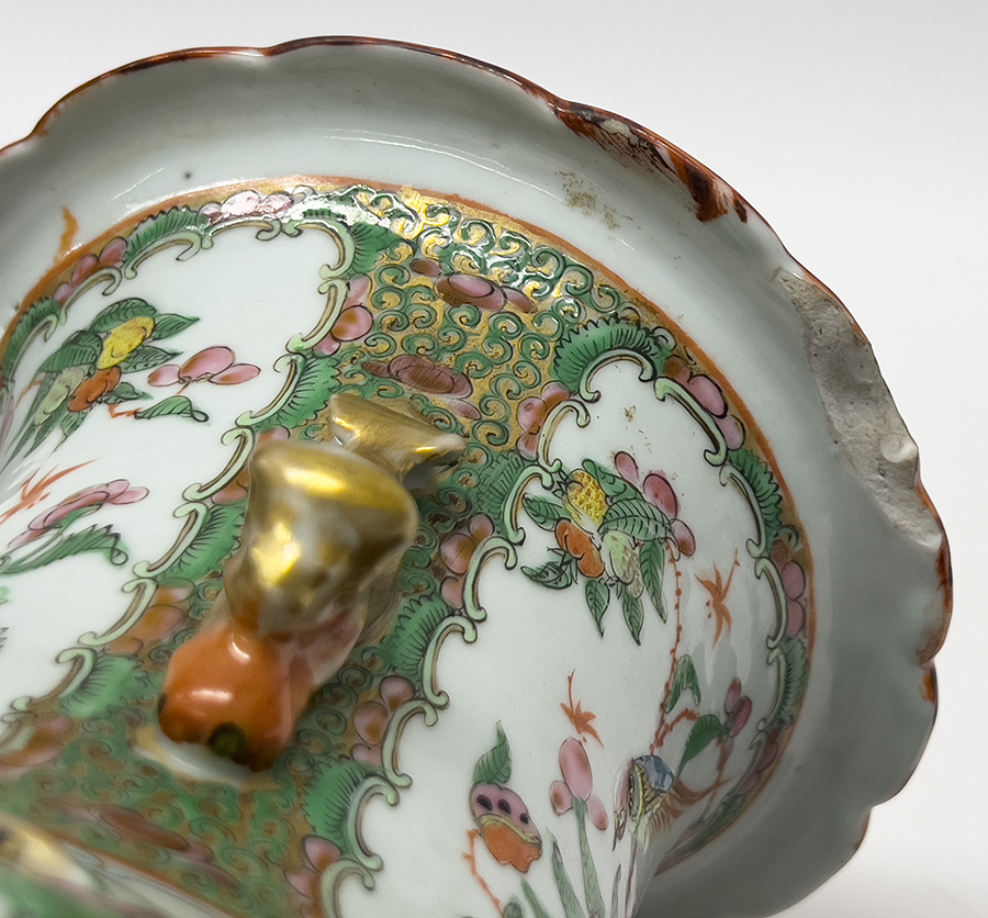 One has chip to underside of rim and tip of applied dragon foot missing.