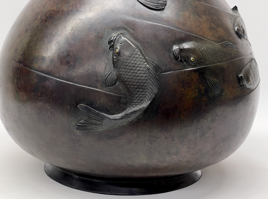 several swimming carp with mixed metal eyes in relief; kanji signature in an oval to bottom; 21"h; top 8"diam.