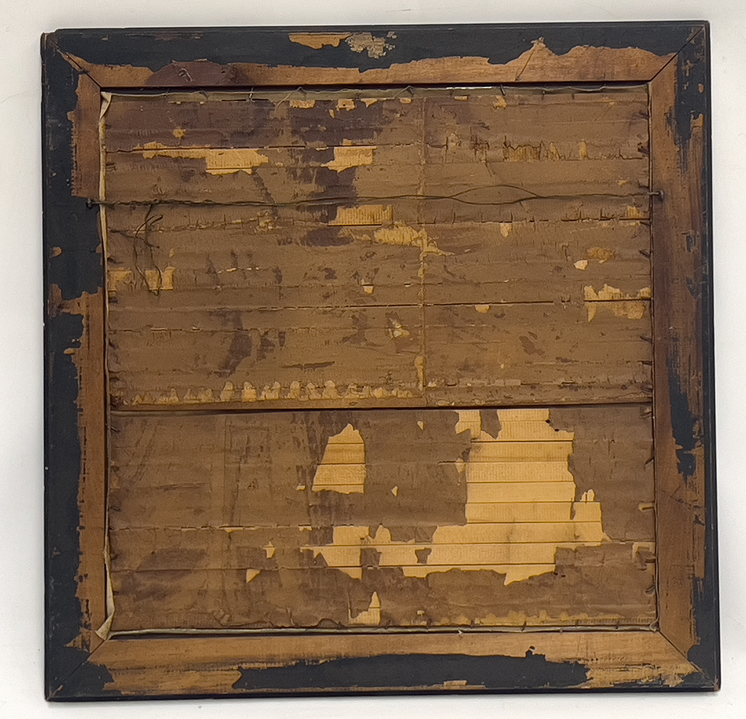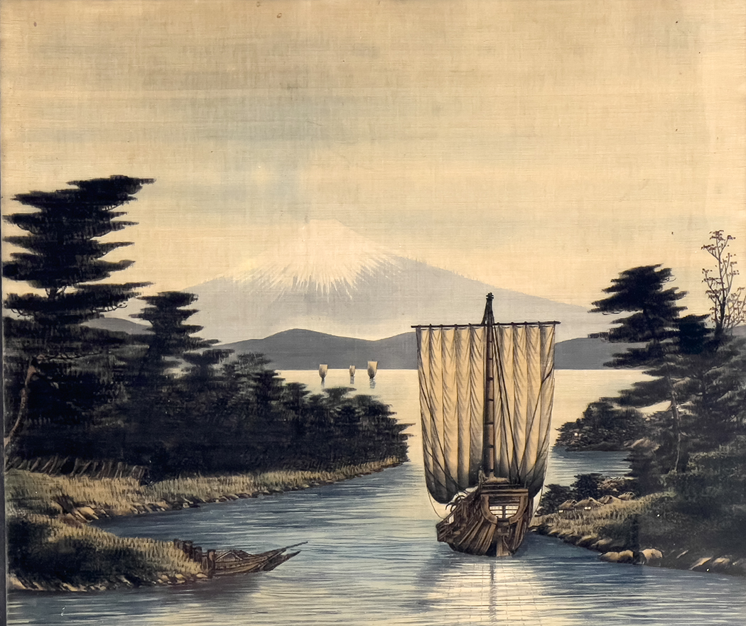 Meiji Period, late 19th c.; sail boats on Lake Kawaguchi, pine trees on shore, Mt. Fuji in distance; 23.5 in. sq.; original backing boards and frame, 29 in. sq.