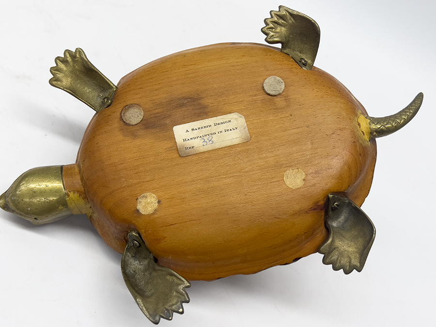 carved wood shell; brass head, feet and tail; 4"h; 11.5"w; 7.5"d