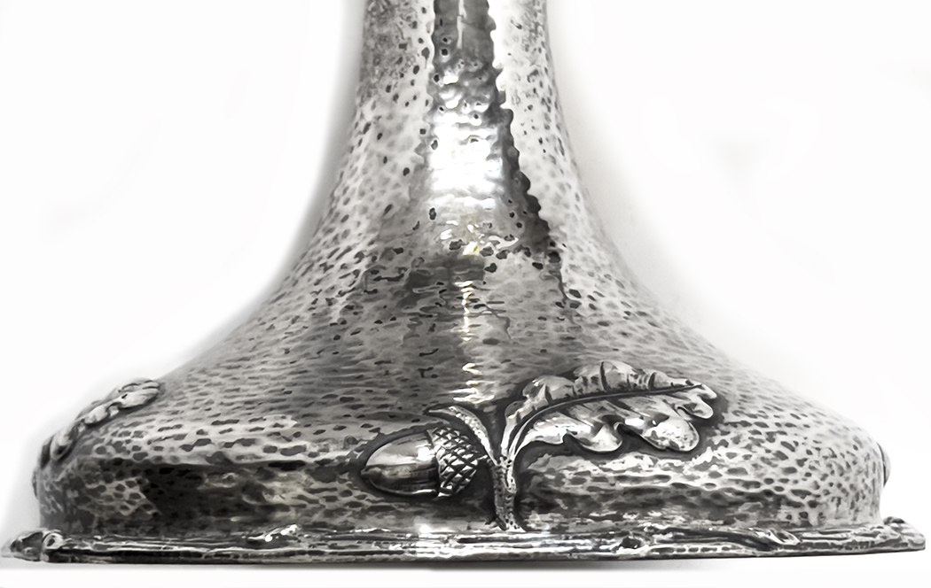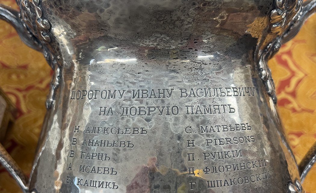 hammered surface with chases acorns and oak leaves; inscribed with seven lines of cyrillic script; 12.5"h; opening 7"diam; 11.5" incl. handles; 50.5 oz troy