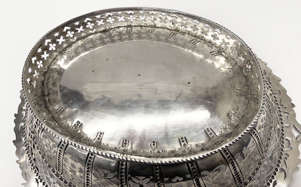 hallmarked: C A H G (Charles Aldridge & Henry Green 1769-70); crowned leopard, date mark O; footed basket with braided swing handle; reticulated lattice, star and geometric designs to sides; berry and vine rim, etched family crest to bowl of basket; 4"h (not incl. handle); 13"w; 11.5"d; 26 troy oz.