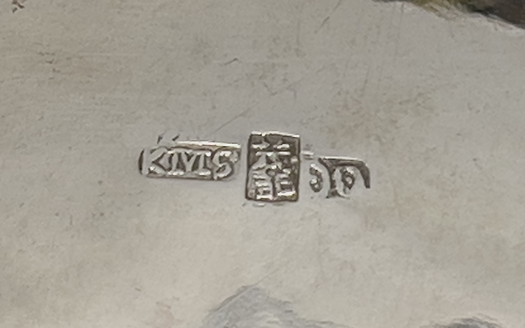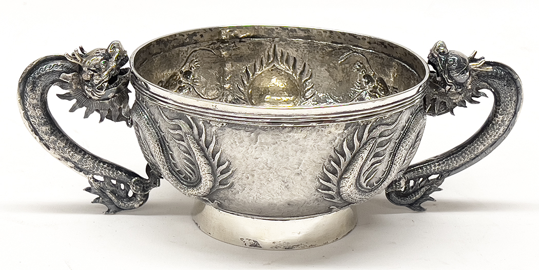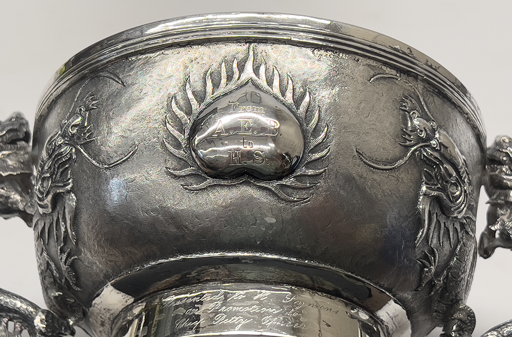 Chinese hallmark; the body with pair of dragons centering a radiating, reversed heart inscribed 'From A.E.B, To H.S'; also inscribed in script on side of footed base 'Presented to H. Lymons as Promotion to Chief Petty Officer'; applied dragon handles; 3"h; 5.25"diam.; tongs with applied lotus design hallmarked KMS/06/rearing lion 5.5"; 12 total troy oz.
