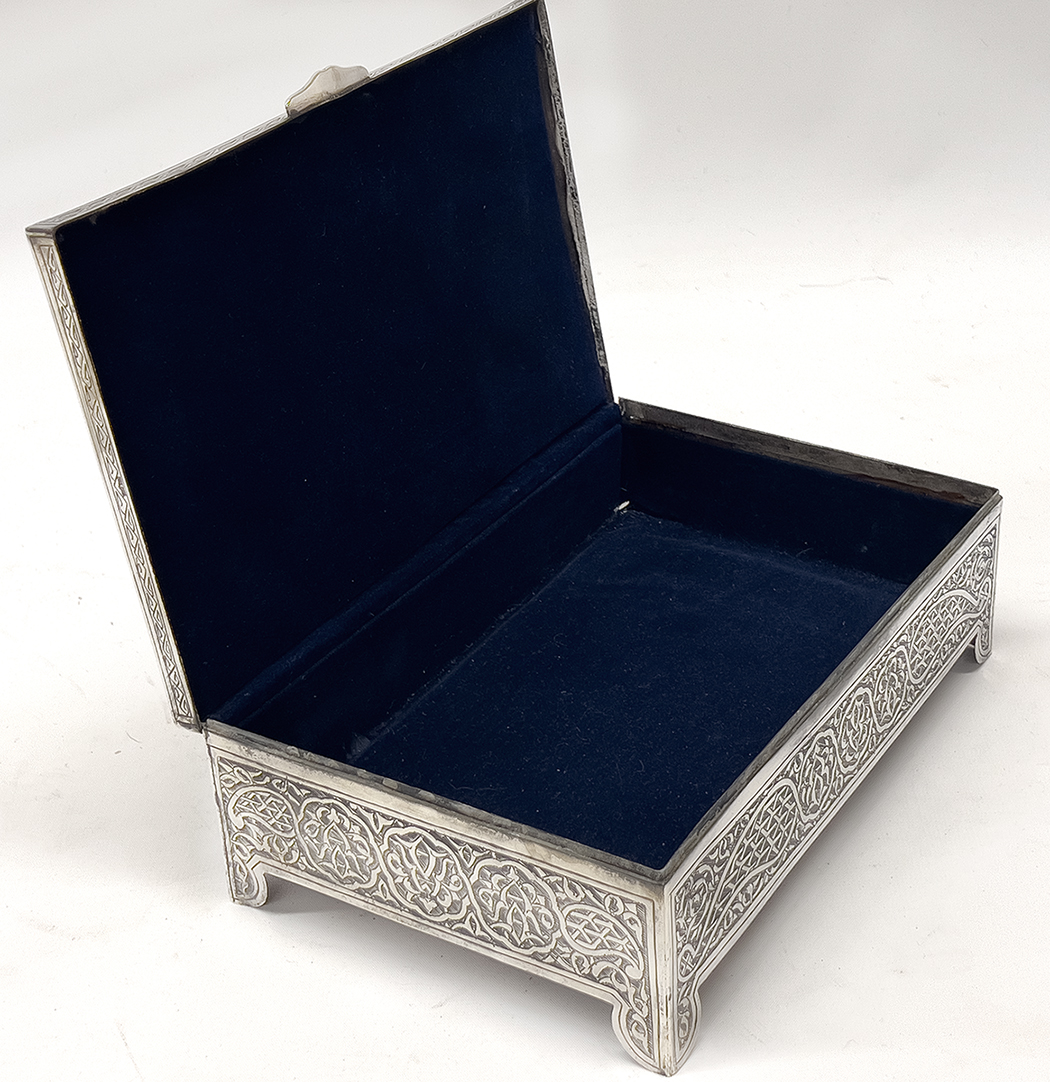 1940's; hallmarked; hinged lid with Arabic monogram; overall Middle Eastern design; lined with blue velvet; 3.5"h; 8.5"w; 6"d; 28.3 oz troy
