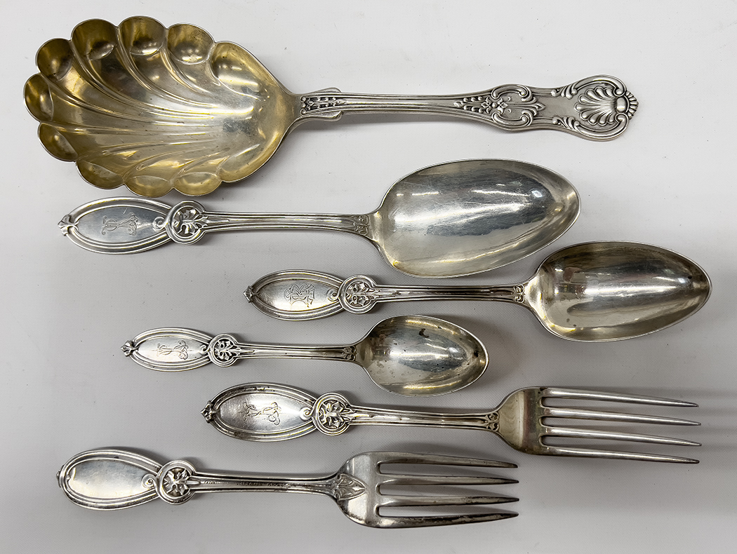 consisting of (12) dinner forks; (6) tablespoons; (6) teaspoons; (6) serving spoons; 41 total troy oz. along with a BAILEY, BANKS & BIDDLE Co. STERLING SERVING SPOON, 3.9 troy oz.; all totaled 45.2 troy oz.