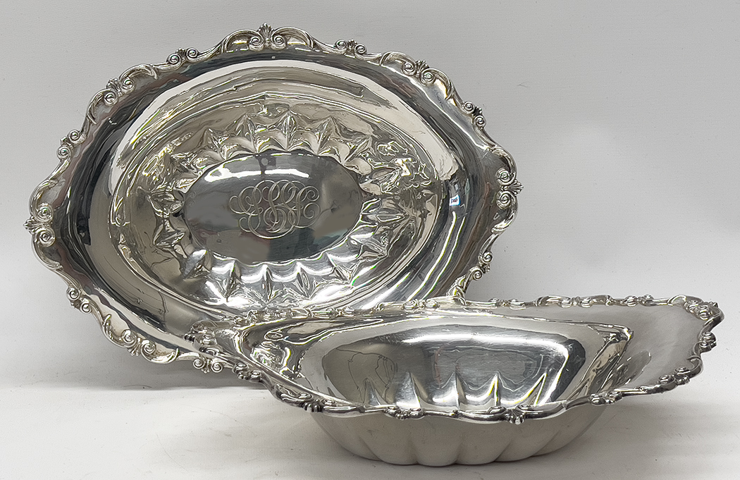 PAIR OF STERLING OVAL VEGETABLE DISHES, Bailey Banks & Biddle, 3"h, 11" (20.3 troy oz.); CHASED PIN TRAY, 5";a RETICULATED CANDY DISH, 1.5"h, 7"diam.; and a SMALL LOVING CUP, March 29, 1902,...From His Godfather, Henry LE Barre Jayne, 5"; total 31.9 troy oz.