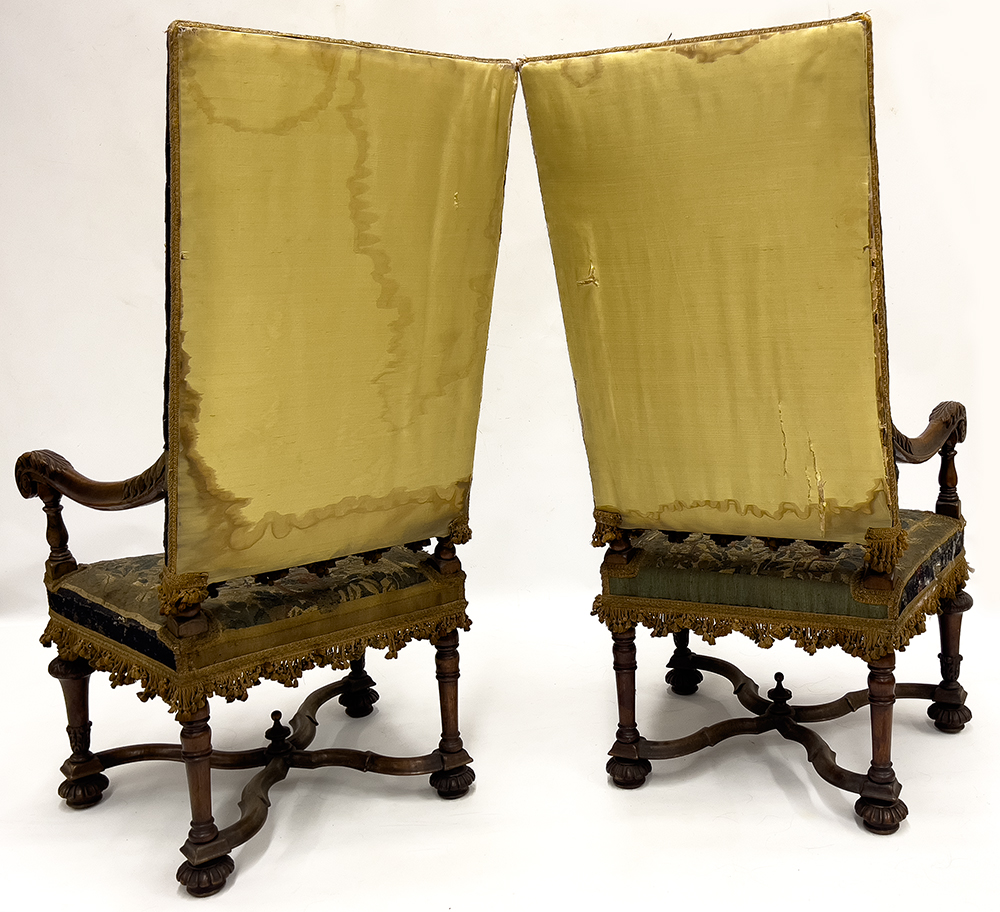 19th c.; early French tapestry to the tall backs and seats; scrolling, acanthus leaf-carved arms; legs joined by x-stretcher; 50"h; 24"w; 19"d; seat height 18"
